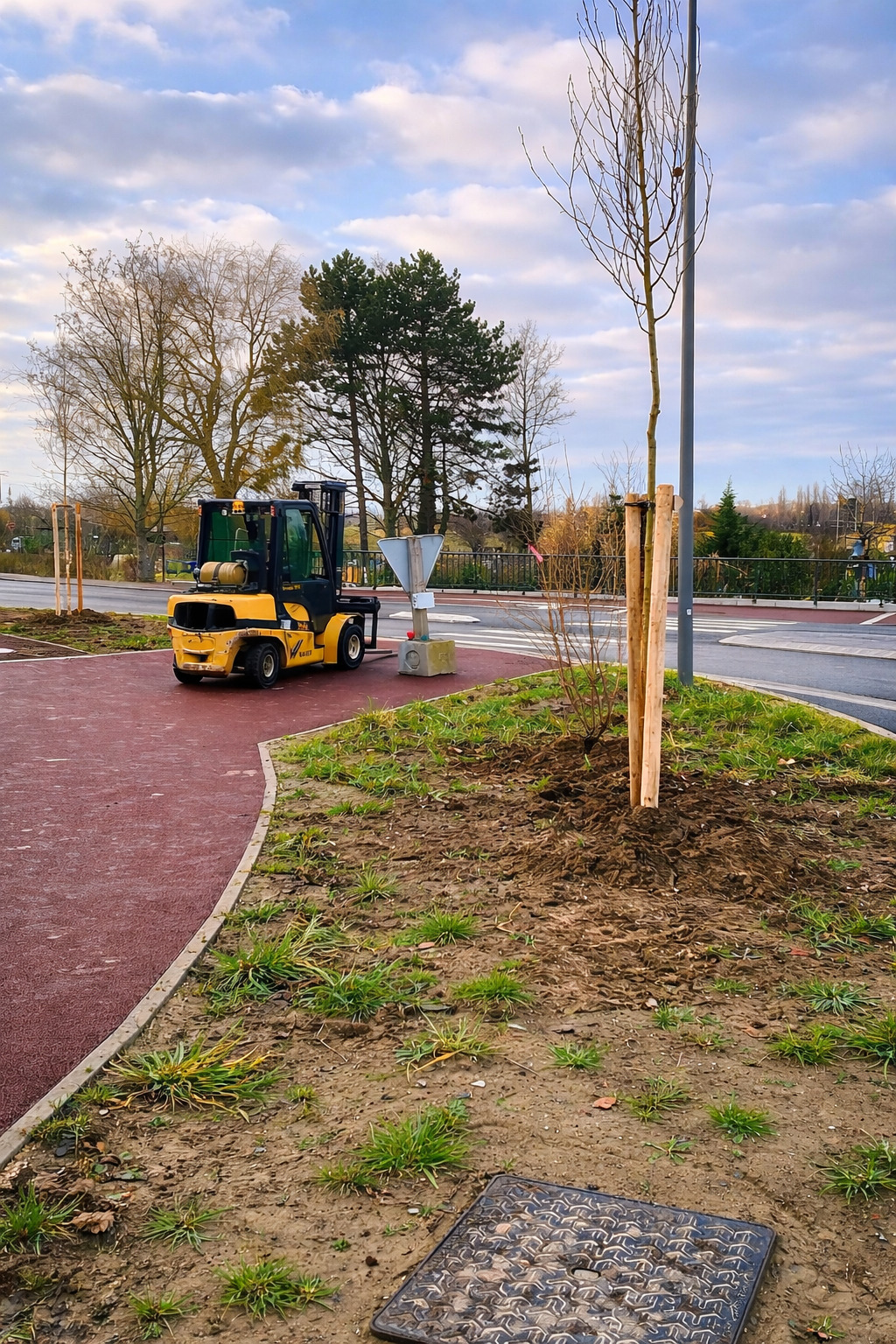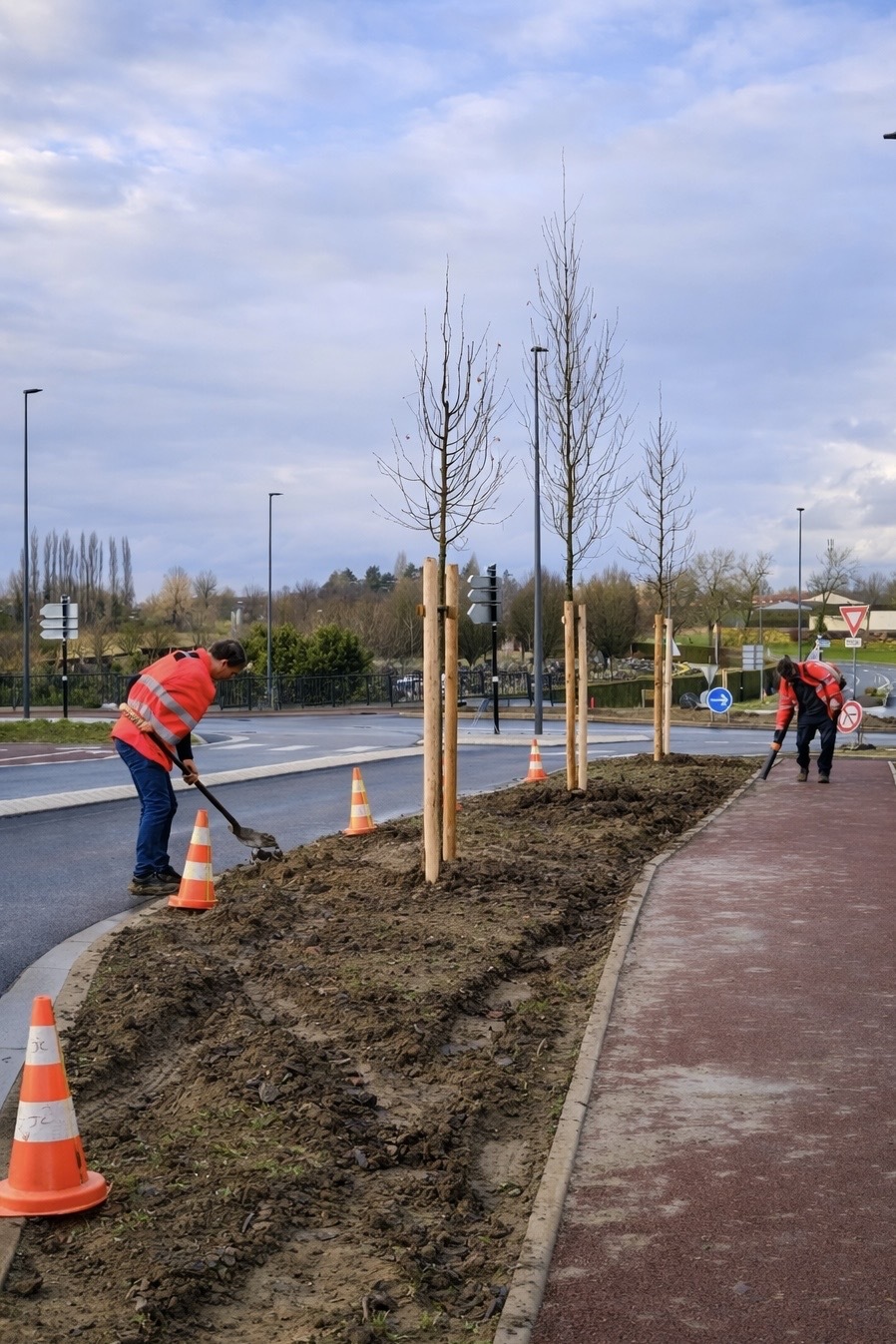 Des arbres et arbustes sont progressivement mis en place dans les parterres aménagés autour du rond-point : aulnes, érables, tilleuls, bouleaux. Le choix de ces différentes essences permet de diversifier le paysage, de limiter la propagation des maladies et de favoriser un développement durable et harmonieux des plantations.